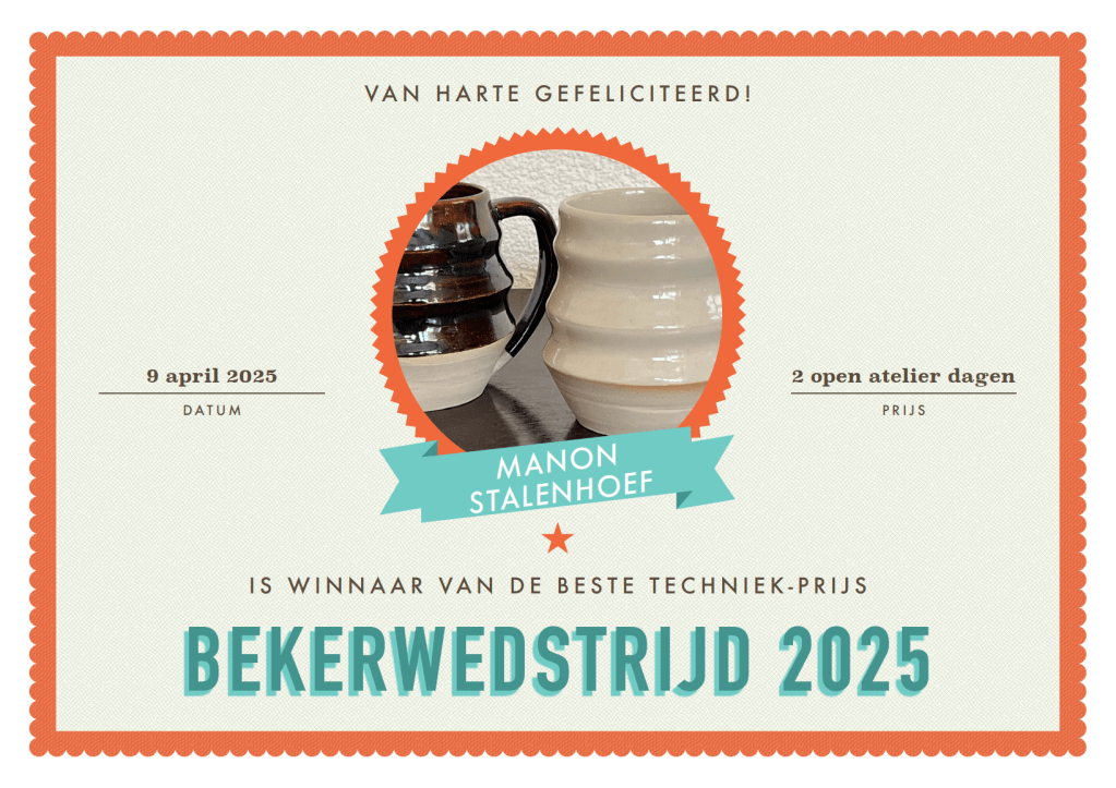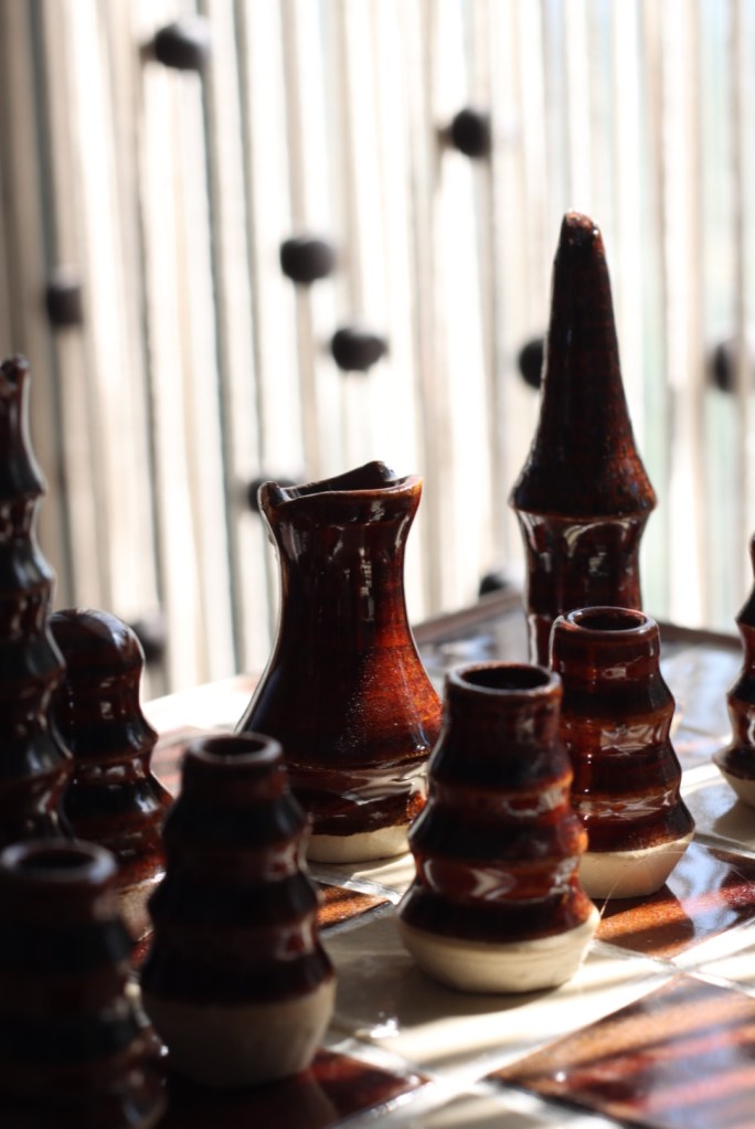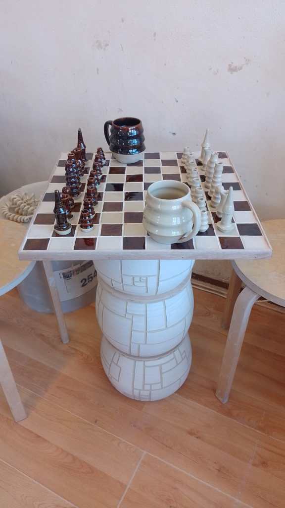Een schaak- en dambord met een tafelpoot eronder en een schaakset erop. Dat werd mijne eindwerk voor de Kleiacademie in Amsterdam. Na een aantal schetsen te hebben gemaakt, ging ik aan de slag. De pionnen zwijn van de mast gedraaid en met de hand verder bewerkt. Vervolgens waren er meer dan honderd tegeltjes nodig, uitgesneden uit platen. Als laatst kwam de tafelpoot aanbod. Opgedeeld uit drie bakken, gedraaid uit ongeveer 7 kilo per stuk, past je been er net onder als je aan tafel gaat zitten. De kers op de taart zijn de twee bijpassende bekers. Deze hebben de beste techniek-prijs gewonnen in de Bekerwedstrijd!