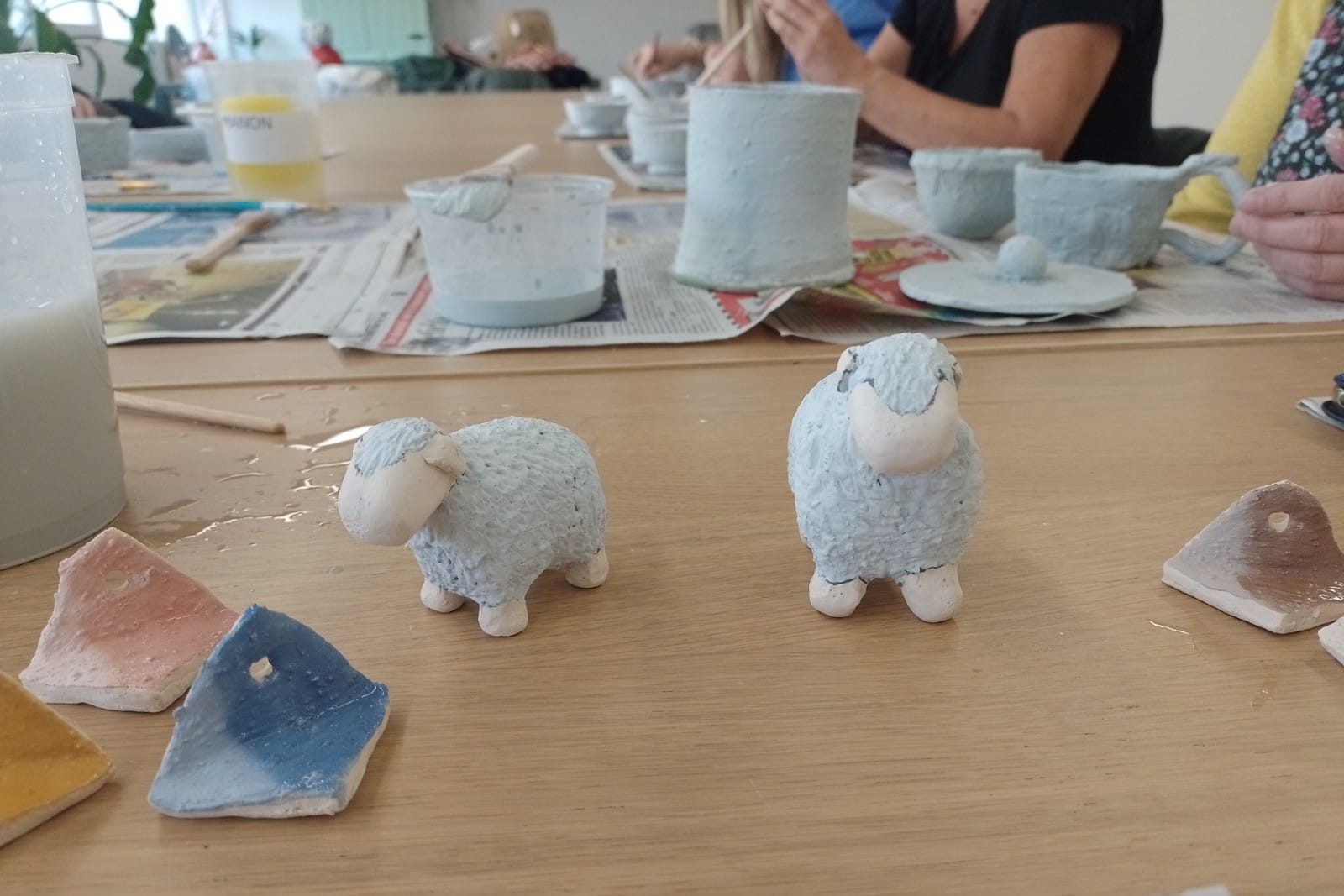 Een duimpotje, opbouwen met ringen, iets met platen maken en vervolgens een beeldje uithollen. Het decoreren is gebeurd met engobe van verschillende kleuren. Als laatste les is er met de kwast een transparant glazuur aangebracht. Er zijn hele leuke, originele en kunstzinnige beeldjes, potjes en bordjes gemaakt in een korte tijd.